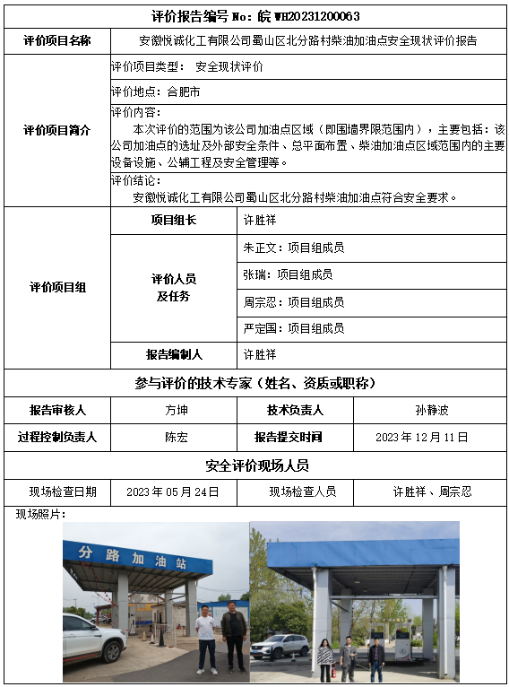 安徽悅誠(chéng)化工有限公司蜀山區(qū)北分路村柴油加油點(diǎn)安全現(xiàn)狀評(píng)價(jià)報(bào)告