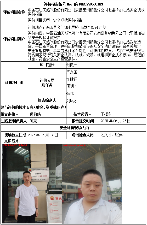 中國(guó)石油天然氣股份有限公司安徽亳州銷售分公司七里橋加油站安全現(xiàn)狀評(píng)價(jià)報(bào)告