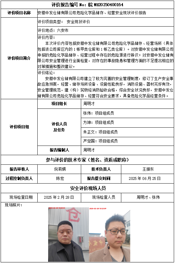 安徽中發(fā)倉儲有限公司危險化學(xué)品儲存、經(jīng)營安全現(xiàn)狀評價報告