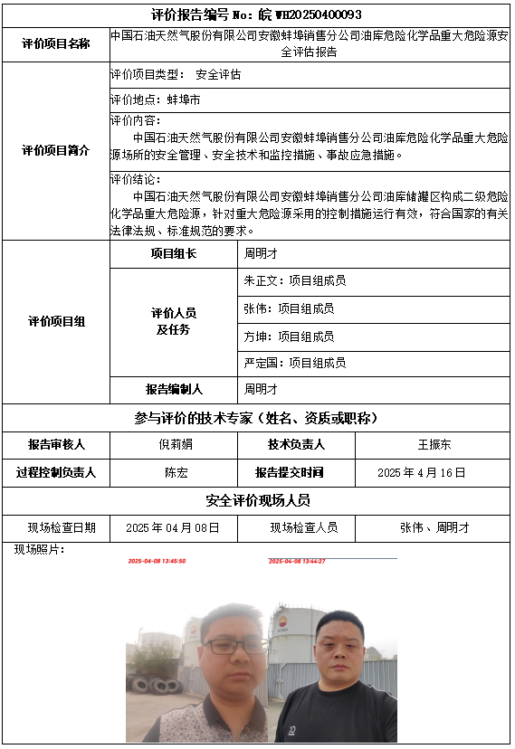 中國石油天然氣股份有限公司安徽蚌埠銷售分公司油庫危險化學(xué)品重大危險源安全評估報告