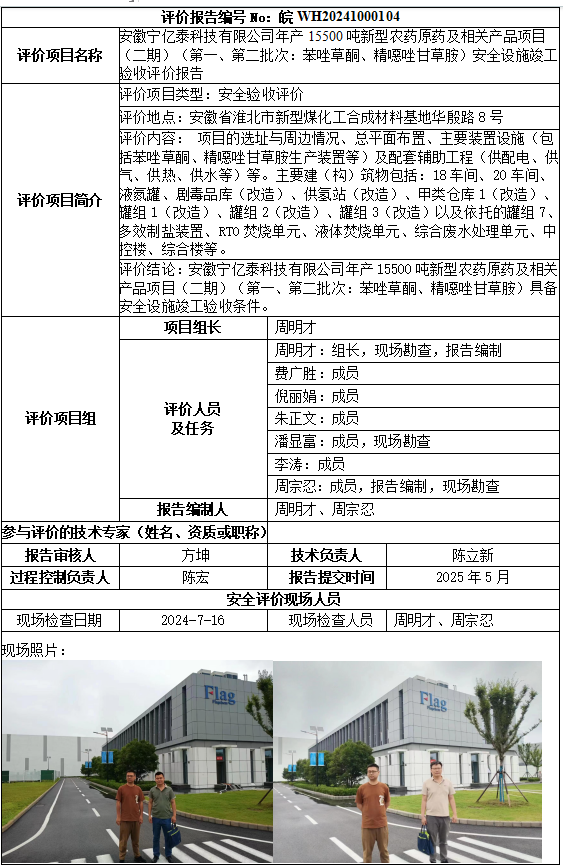 安徽寧億泰科技有限公司年產(chǎn)15500噸新型農(nóng)藥原藥及相關(guān)產(chǎn)品項目(二期)(第一、第二批次:苯唑草酮、精噁唑甘草胺)安全設(shè)施竣工驗收評價報告