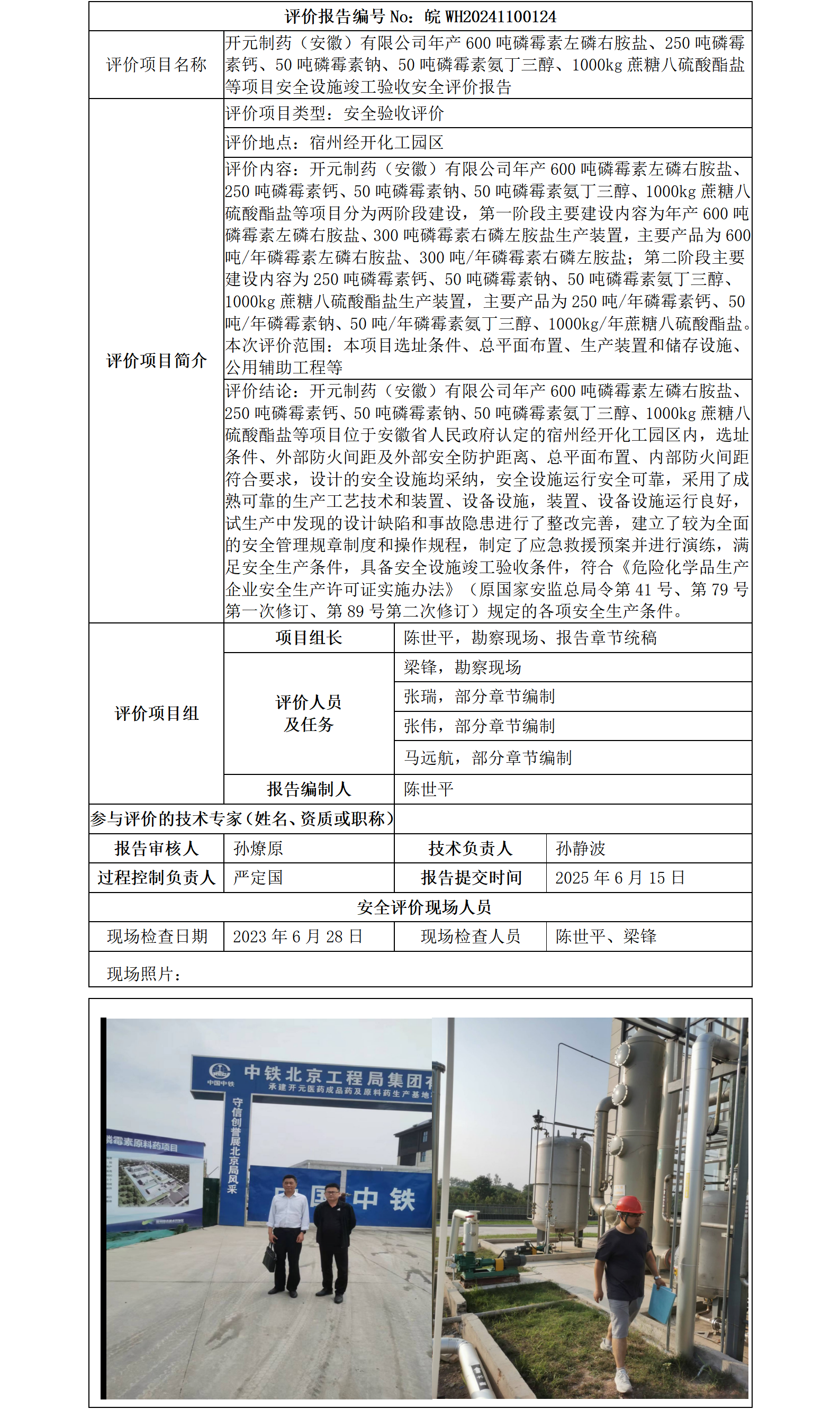 開元制藥(安徽)有限公司年產(chǎn)600噸磷霉素左磷右胺鹽、250噸磷霉素鈣、50噸磷霉素鈉、50噸磷霉素氨丁三醇、1000kg蔗糖八硫酸酯鹽等項目安全設(shè)施竣工驗收安全評價報告