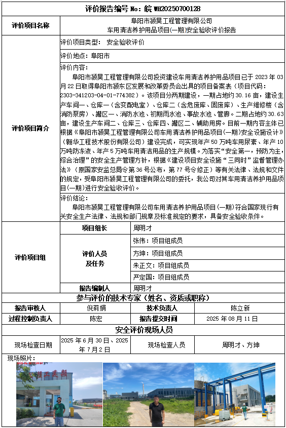 阜陽(yáng)市潁昊工程管理有限公司車用清潔養(yǎng)護(hù)用品項(xiàng)目(一期)安全驗(yàn)收評(píng)價(jià)報(bào)告