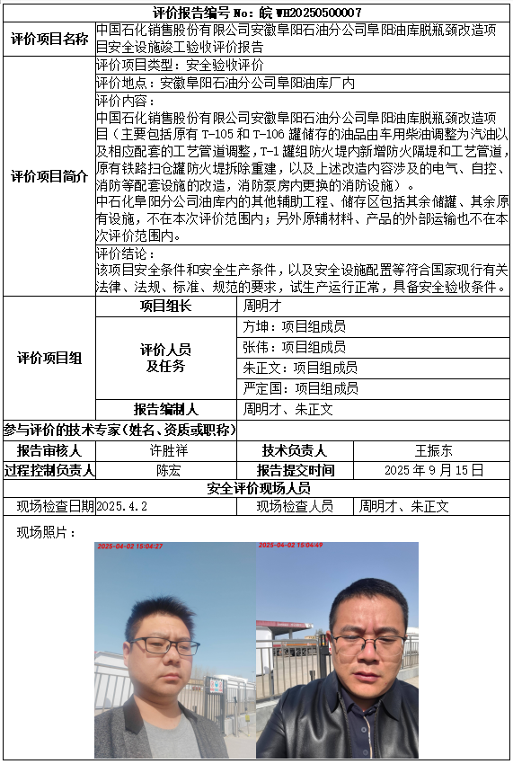 中國(guó)石化銷售股份有限公司安徽阜陽(yáng)石油分公司阜陽(yáng)油庫(kù)脫瓶頸改造項(xiàng)目安全設(shè)施竣工驗(yàn)收評(píng)價(jià)報(bào)告