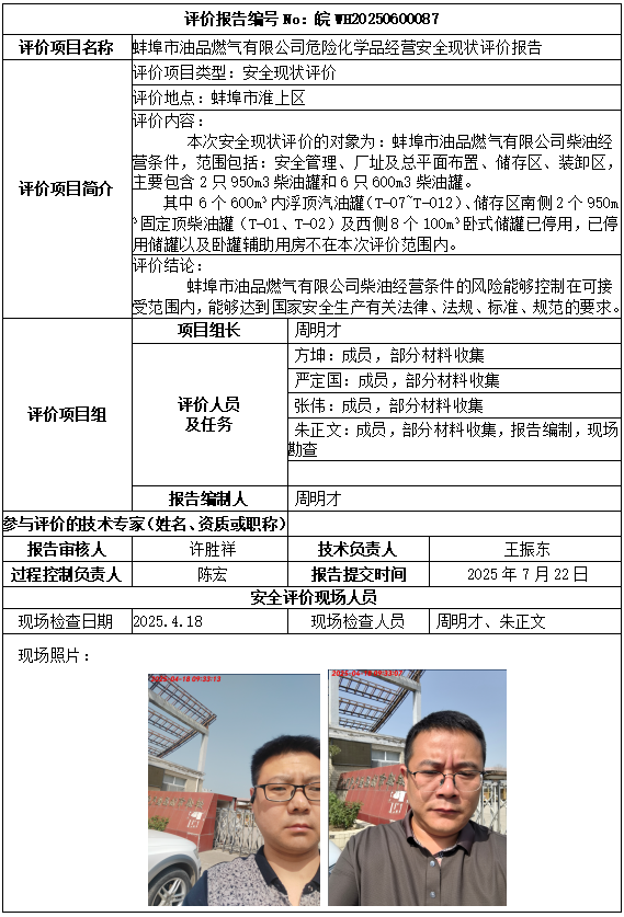蚌埠市油品燃氣有限公司危險化學(xué)品經(jīng)營安全現(xiàn)狀評價報告