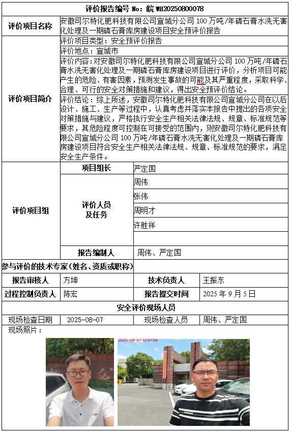 安徽司爾特化肥科技有限公司宣城分公司100萬噸/年磷石膏水洗無害化處理及一期磷石膏庫房建設項目安全預評價報告