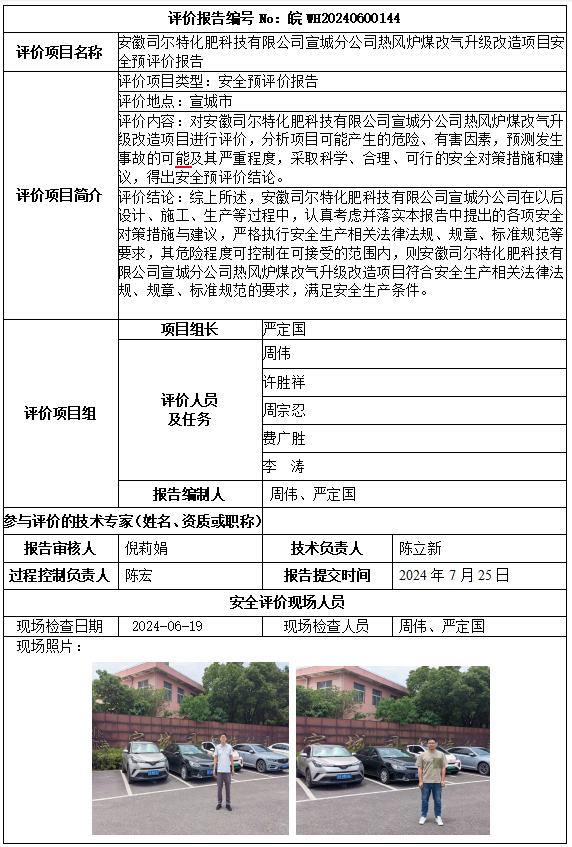 安徽司爾特化肥科技有限公司宣城分公司熱風爐煤改氣升級改造項目安全預評價報告
