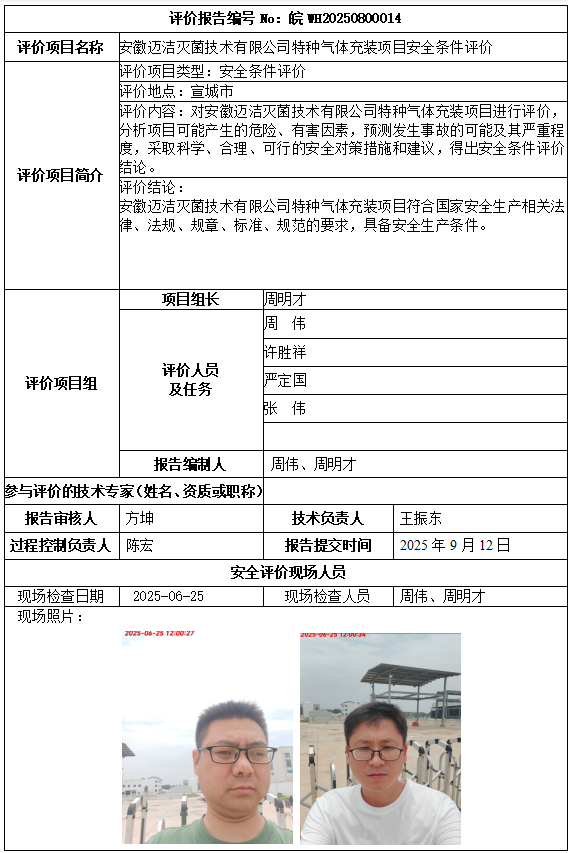 安徽邁潔滅菌技術有限公司特種氣體充裝項目安全條件評價