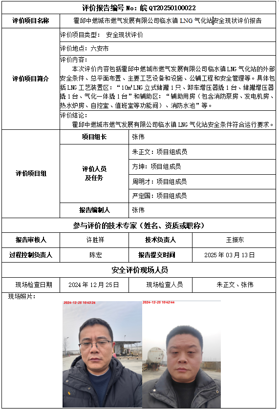 霍邱中燃城市燃?xì)獍l(fā)展有限公司臨水鎮(zhèn)LNG氣化站安全現(xiàn)狀評價報告