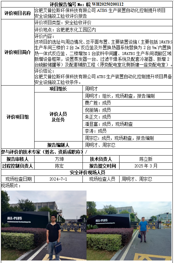 合肥艾普拉斯環(huán)保科技有限公司ATBS生產(chǎn)裝置自動(dòng)化控制提升項(xiàng)目 安全設(shè)施竣工驗(yàn)收評(píng)價(jià)報(bào)告