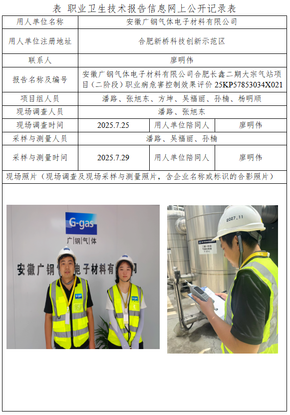 安徽廣鋼氣體電子材料有限公司合肥長鑫二期大宗氣站項目(二階段)職業(yè)病危害控制效果評價報告